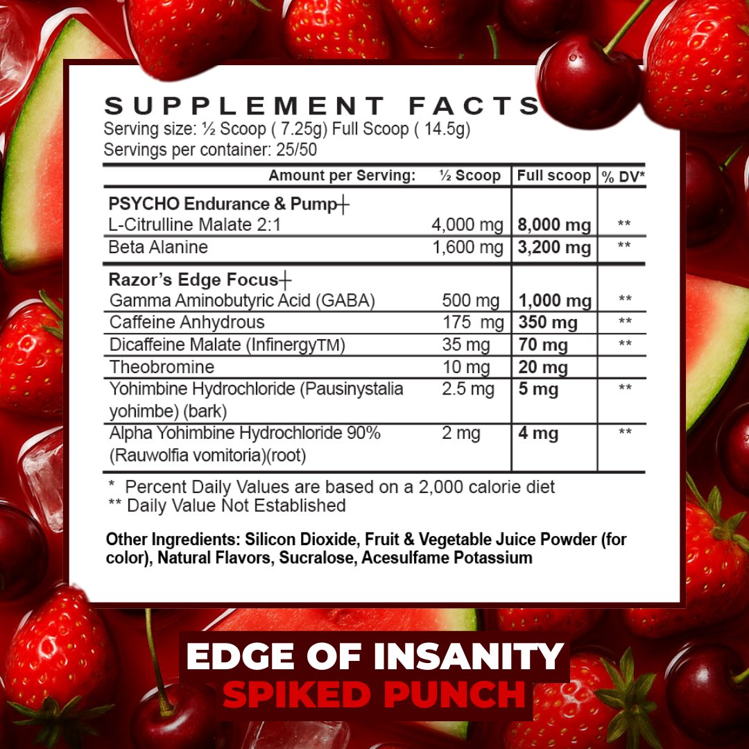 Beta-Alanine is a naturally occurring amino acid in muscle tissue and the brain. Included in Edge of Insanity at an effective dose of 3,200mg per serving, it will block the accumulation of lactic acid in your muscles. This will delay fatigue during repeated bouts of intense exercise with short recovery periods.