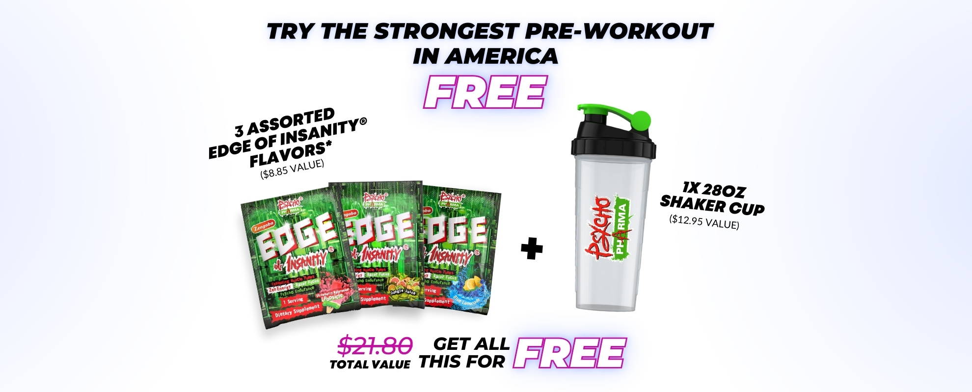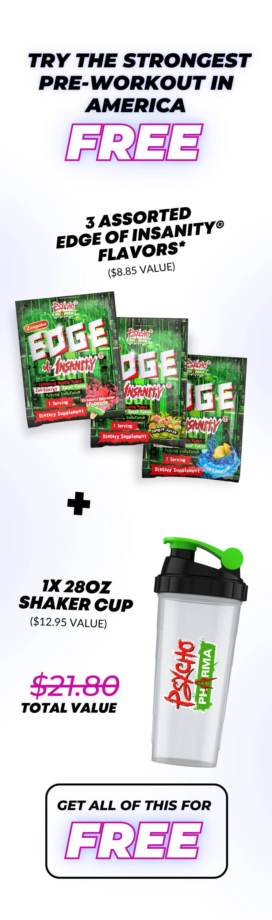 *Flavors shown are examples. Each order includes an assorted set of three powerful Edge of Insanity flavors. We can’t guarantee specific flavors due to availability, but every set packs the intense pre-workout punch you crave!